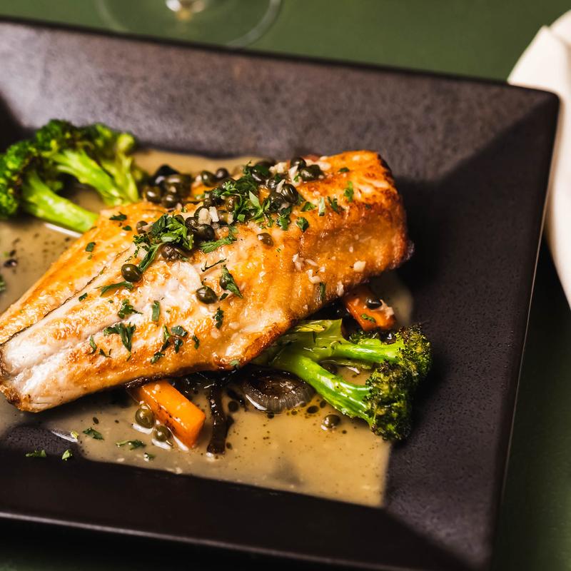 Crispy skin filet in a white wine, butter, and capers sauce served with grilled vegetables