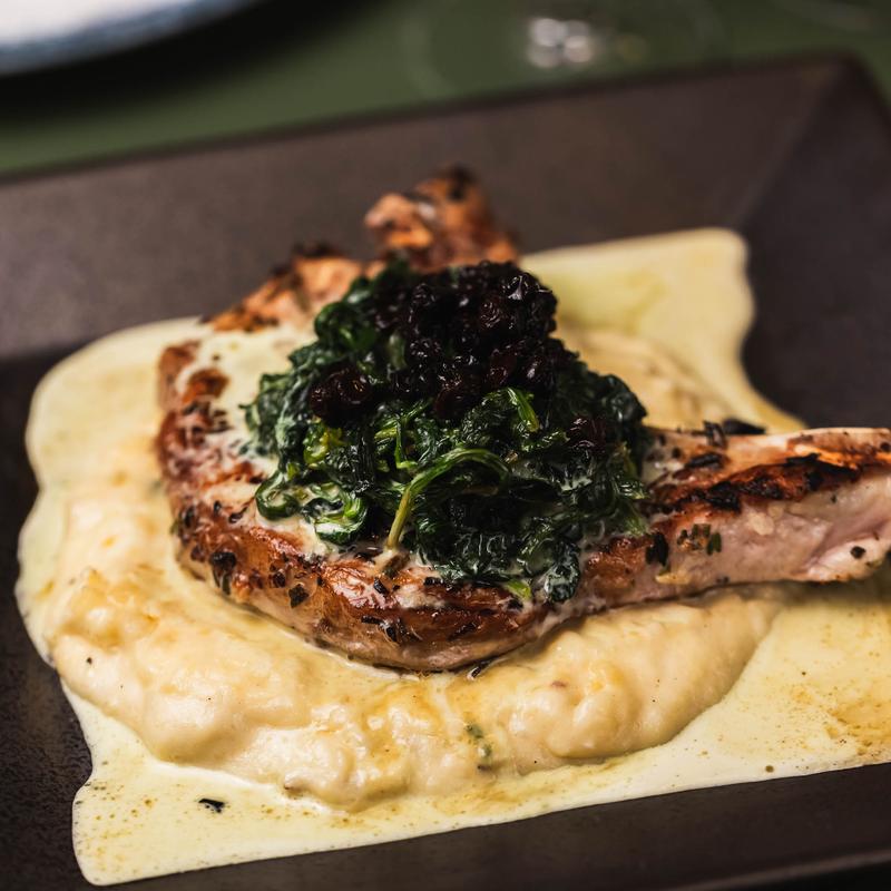 Sautéed spinach with cream, currants agrodolce, garlic mashed potatoes