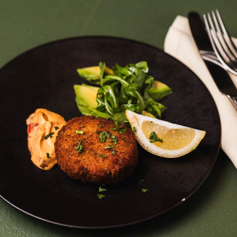 Lump crab cake, avocado, and white balsamic vinaigrette, calabrian chili remoulade
