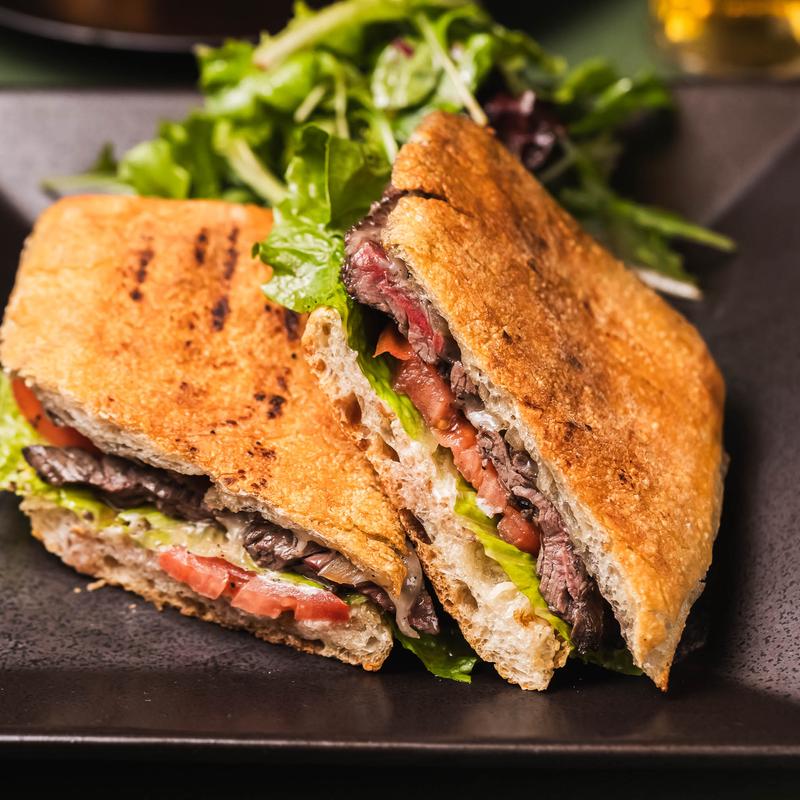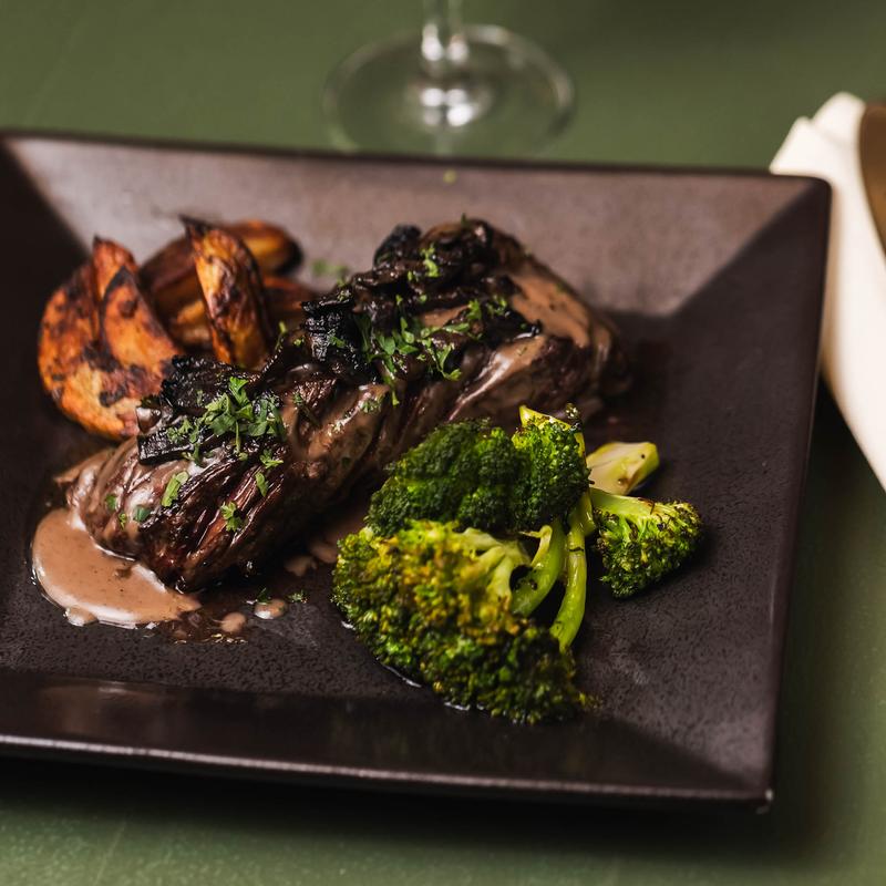 10oz steak, wild mushroom, creamy barolo reduction, served with roasted potato wedges and sautéed broccoli