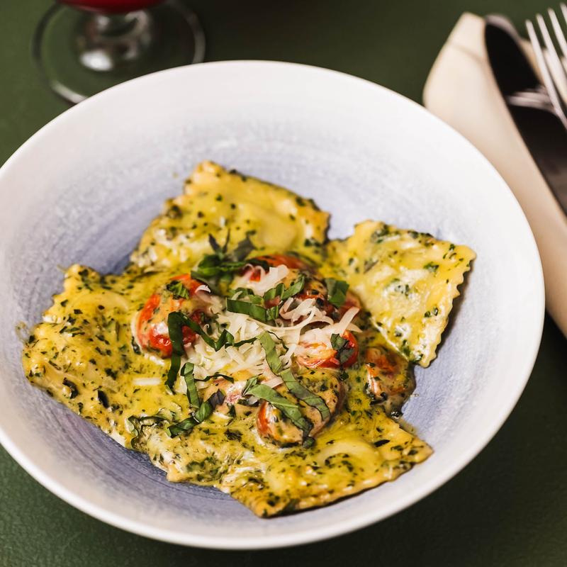Creamy basil pesto with pine nuts, roasted cherry tomatoes, parmigiano